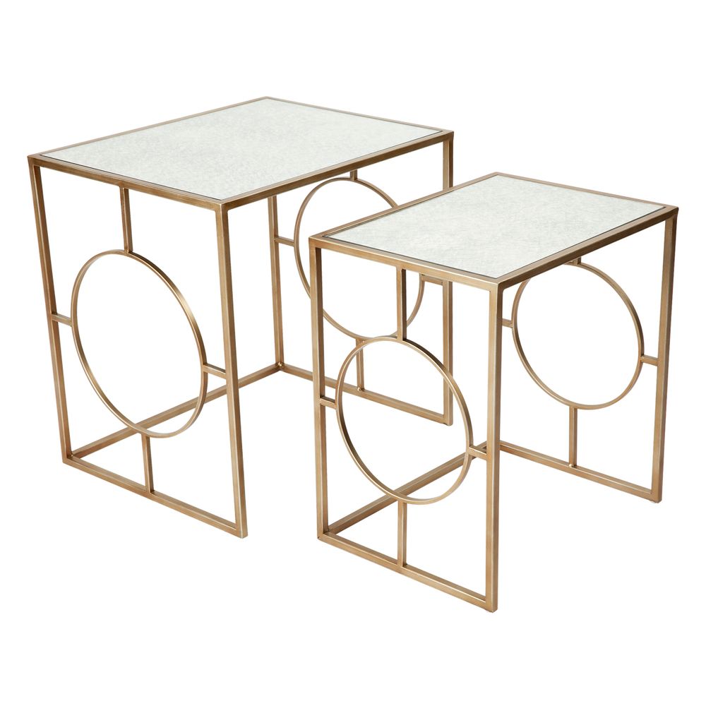 Antique gold iron frame, 2 piece nest of tables with antique mirror top and circle design sides.