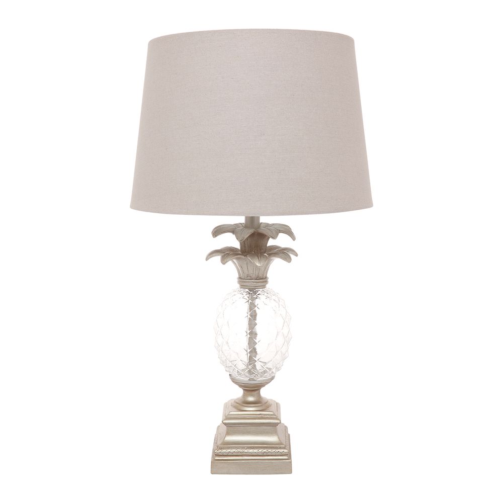 Langley Table Lamp – Antique Silver & Glass Pineapple Design Elevate your interiors with the Langley Table Lamp, a perfect blend of elegance and versatility. Featuring a pineapple-inspired base, this beautifully proportioned lamp symbolizes friendship and hospitality, making it an exquisite addition to any space. Crafted with a clear-cut glass pineapple center, complemented by an antique silver plinth and crown, the Langley lamp radiates luxury and charm. The fawn linen tapered drum shade enhances its timeless appeal, seamlessly fitting into both classic and contemporary interiors. Ideal for use as a pair on bedside tables or positioned at either end of a console table, the Langley Table Lamp adds a regal yet fresh aesthetic to your home. Whether styled in a modern or traditional setting, this statement piece offers a warm and inviting ambiance. Illuminate your space with the Langley Table Lamp where timeless design meets sophisticated style.