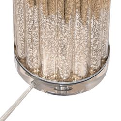 The Allure Table Lamp is a timeless piece that adds elegance to any space. Featuring a stunning mercury glass base with subtle patterning, it offers a sophisticated metallic tonal mix that complements any color palette. The lamp is topped with a white linen drum shade, and stands at an impressive 76cm in height, making it a striking statement on its own or as a pair. The ribbed glass base creates a mesmerizing glow, enhancing the ambiance of any room with its refined beauty. Perfect for creating a touch of luxury in your home.