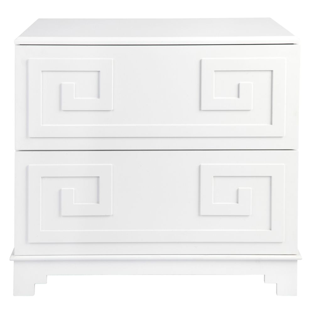 The Greek key bedside table merges inspiration drawn from ancient Greek symbolism together with the bold use of colour and contrast typical to a Hollywood Regency design style to deliver a sense of grandeur and opulence. A continuous linear Greek Key symbol, representative of eternity and unity, adorns this two drawer bedside table with a classic white lacquered finish. Generously proportioned, the Greek Key bedside table offers style and practical storage solutions for your bedroom space.