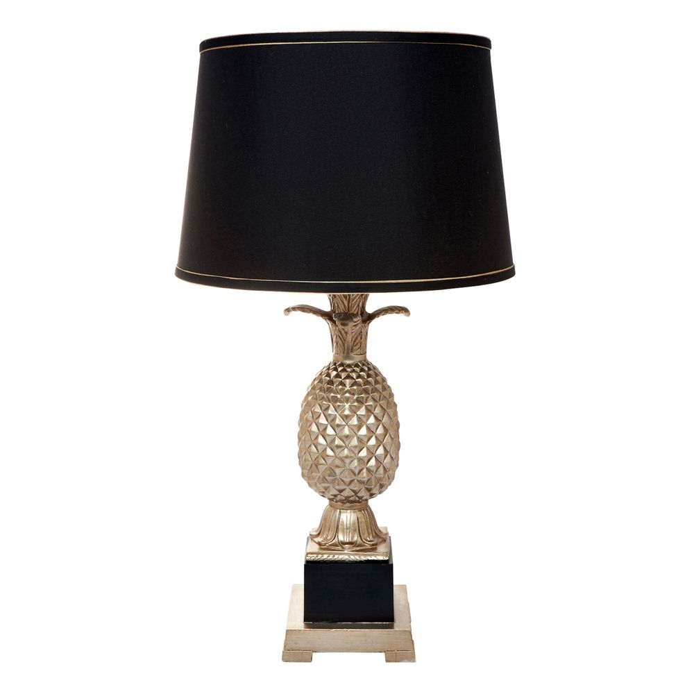 Add a touch of unique style to your space with the Harper Pineapple Table Lamp. Designed with a textured resin base and elegant gold leaf pineapple leaves, this lamp creates a warm, ambient glow that enhances any room. Perfect for your entryway side table, it pairs effortlessly with your favorite photos and decorative accents, crafting a cool, eclectic vignette that will impress guests. The lamp is topped with a black linen tapered drum shade, featuring a sophisticated gold trim to complete its modern look. Elevate your décor with this statement piece that blends fun and functionality.