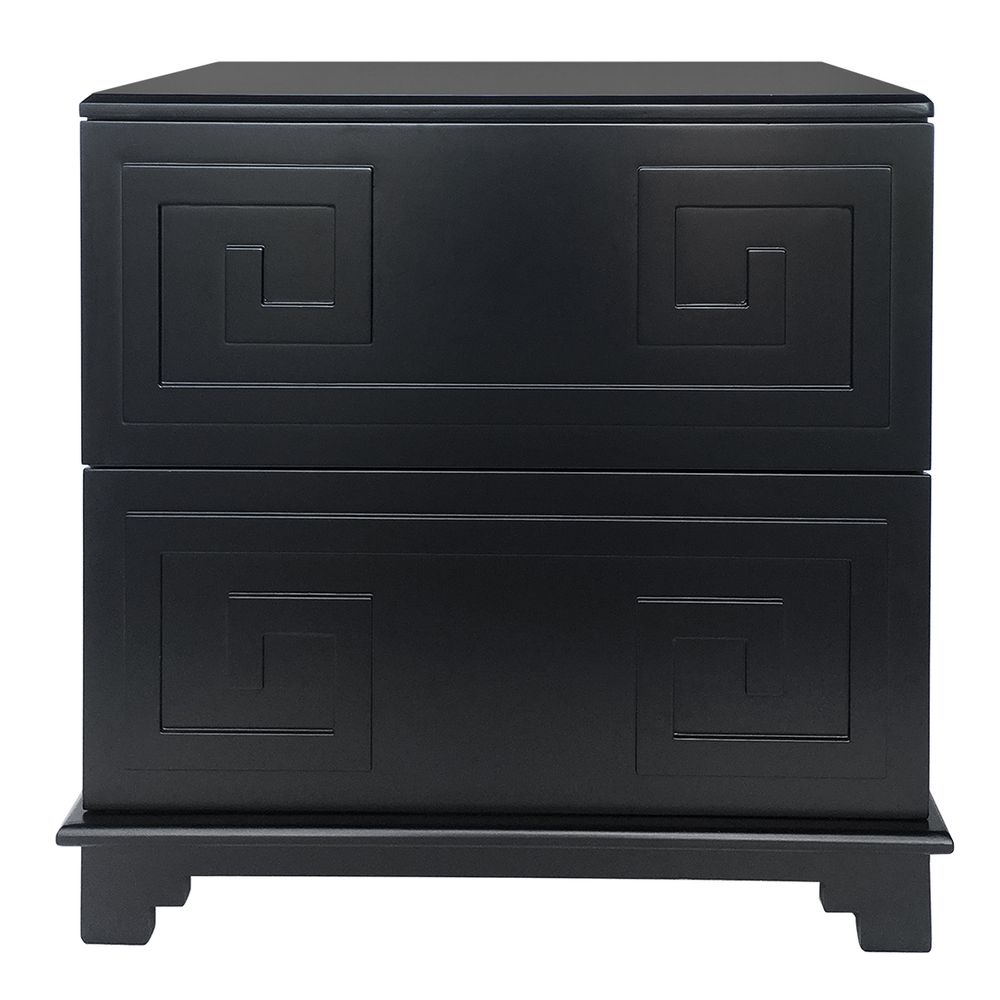 The Greek key bedside table merges inspiration drawn from ancient Greek symbolism together with the bold use of colour and contrast typical to a Hollywood Regency design style to deliver a sense of grandeur and opulence. A continuous linear Greek Key symbol, representative of eternity and unity, adorns this two drawer bedside table with a striking black lacquered finish. Generously proportioned, the Greek Key bedside table offers style and practical storage solutions for your bedroom space.