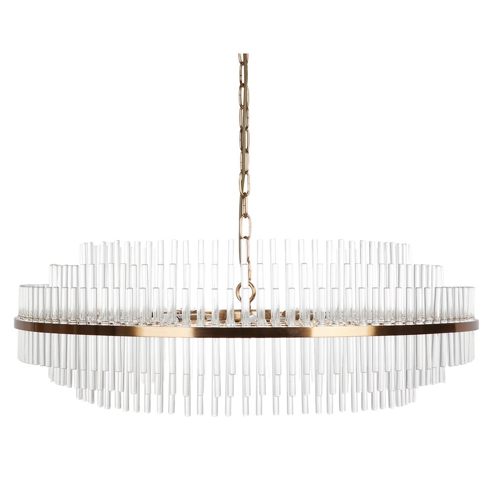 Grand in size and sculptural form, the Lawrence pendant finds a sense of balance between exceptional elegance and extraordinary drama. Crafted with hundreds of clear glass rods delicately dangling from a polished brass frame, the design echoes art deco glamour. The Lawrence pendant commands any living space
