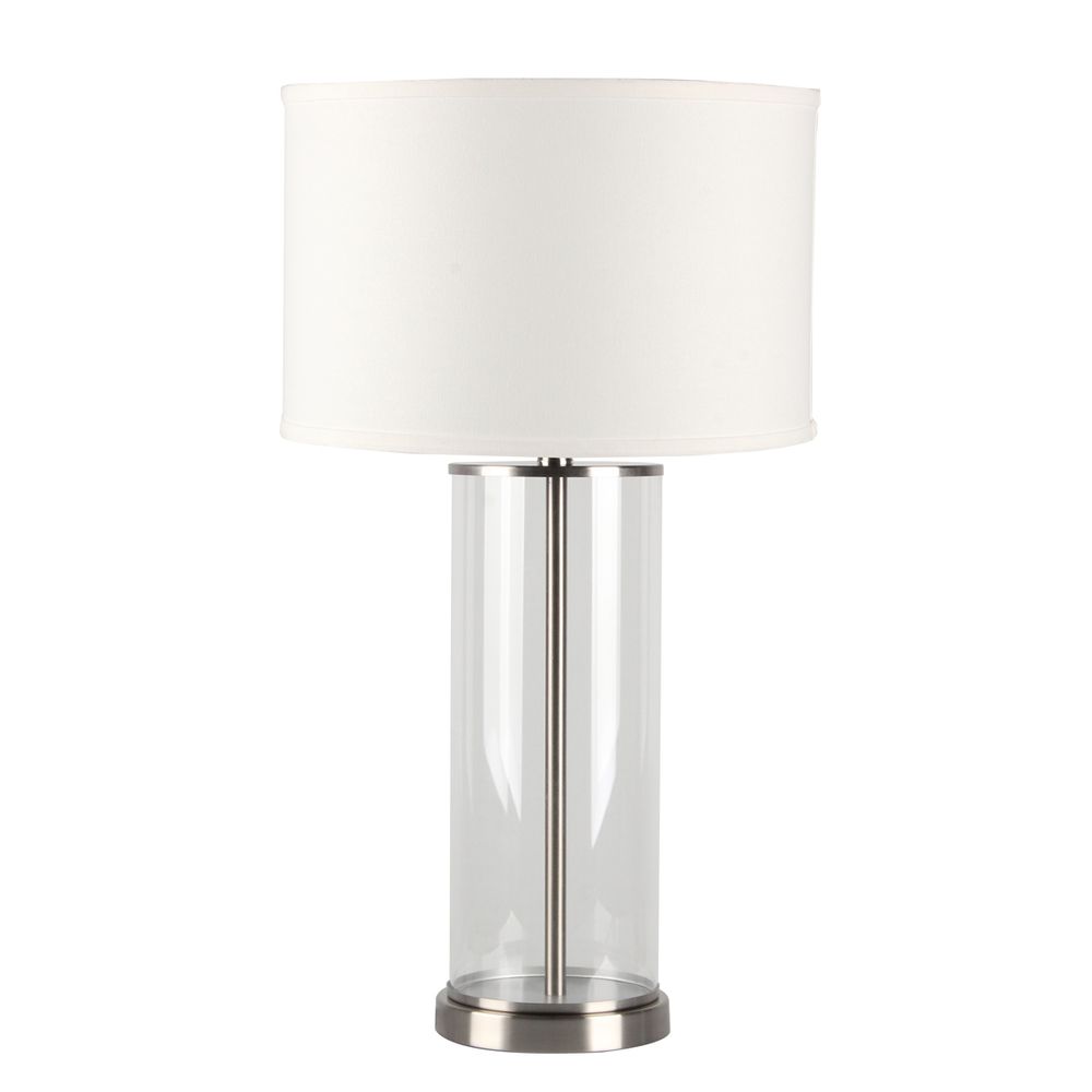 The Left Bank Table lamp is a modern glass table lamp and would be a sleek addition to any space. Features a nickel finish metal rod encased in a clear glass cylinder base trimmed with matching nickel metal. Topped with a white faux linen drum shade.