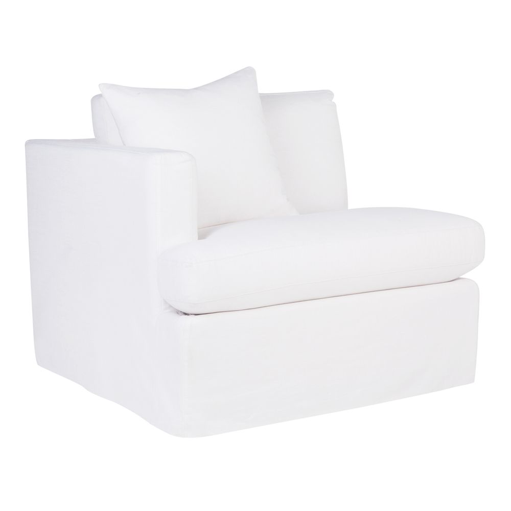 White linen slip cover left arm facing seat. Comfortable soft seating & back with feather & foam fill. Solid hardwood frame with inner spring suspension. Suits most décor from Hamptons, coastal and contemporary living. Slip cover with tailored sides are easily removed for cleaning. Includes a matching scatter cushion. Create your own style modular by adding pieces of the Birkshire range. Professional dry cleaning services only.
