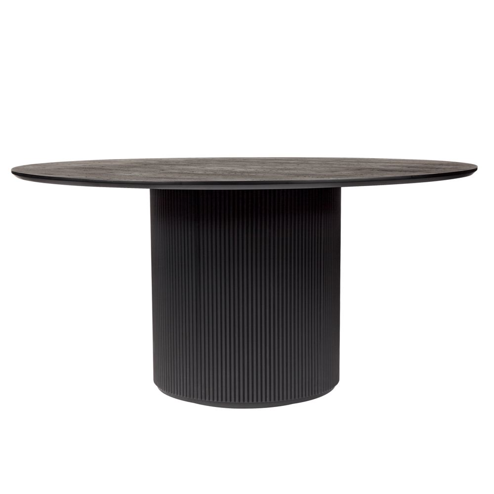 A sleek contemporary statement, the Arlo round dining table unites tactile organic surfaces with bold architectural form and modern finishes. Exquisitely crafted in satin black finished Ash wood veneer, the Arlo features a smooth round table top curving to a beautiful ribbed cylindrical base. Exuding an uncomplicated, urban energy, the simple lines of the Arlo infuse both traditional and modern spaces with striking sculptural style. Available in two sizes to comfortably seat 6 (1.5m) or 4 people (1.2m).