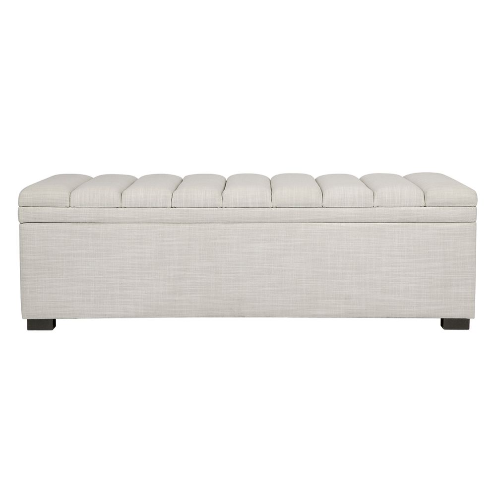 Upholstered in a classic off white linen blend fabric, the Soho storage bench ottoman features a luxuriously panelled top which lifts to reveal ample storage - creating a furniture piece that is both elegant and functional. Classic contemporary in design, the Soho storage bench ottoman is the perfect accent piece for a stylish bedroom, entry or additional living room seating. A beautiful complement to any interior.