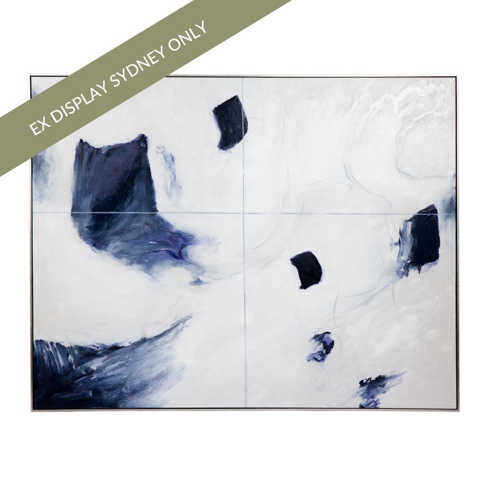 SOH:1 FROM SYDNEY SHOWROOM Ex-Display Unit No Faults, Damages, No Carton - needs a light dusting/clean for it's forever home. Cannot ship to remote locations, only metro. Pickup preferred. DESCRIPTION: Moving Moments oil on canvas offers instant impact due to its ethereal tones, swelling forms and sheer size. An impressive 180 x 140cm, Moving Moments creates an alluring backdrop with its gentle colour palette and abstract form. Fluid brush strokes in subtle tones are interrupted by deep indigo moments offering striking depth and contrast. Beautifully displayed in an antique silver shadow box frame, Moving Moments would add contemporary character to any large entry wall, living or dining room setting.