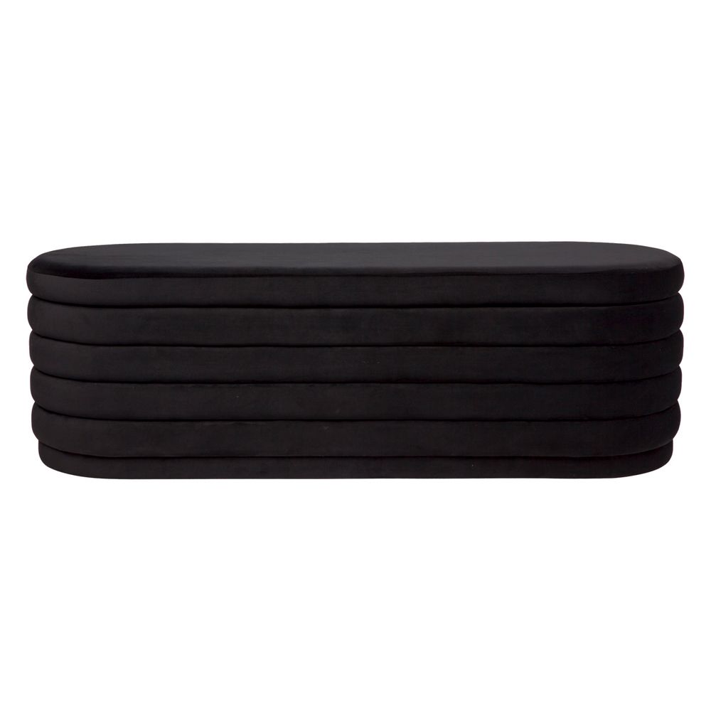 Upholstered in sumptuous black velvet, the Demi storage bench ottoman lends a sense of sophistication to any space. Designed with an effortlessly chic cosmopolitan mood in mind, the panelling detail of the Demi storage bench ottoman enhances its textural quality and adds to its contemporary curve appeal. As practical as it is beautiful, lift the lid on the Demi to reveal ample storage - easy access for throws and cushions when styled as a bed end, Ideal for books or games when used as additional living room seating, or hats and shoes when adorning a stylish entry. Also available in nude or olive velvet, tactile white boucle and off-white linen.
