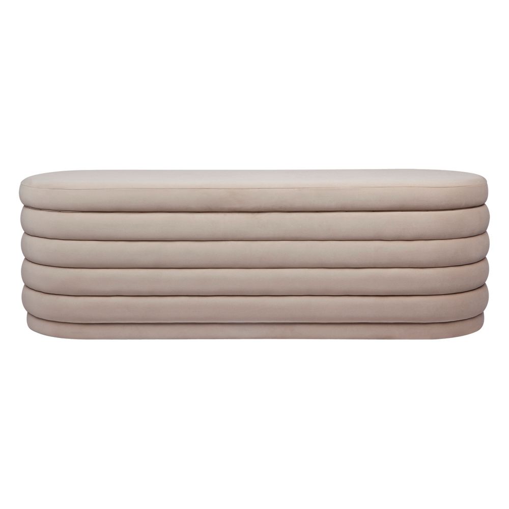 Upholstered in sumptuous nude velvet, the gentle tones and softened profile of the Demi storage bench ottoman lends a sense of sophistication to any space. Designed with an effortlessly chic cosmopolitan mood in mind, the panelling detail of the Demi storage bench ottoman enhances its textural quality and adds to its contemporary curve appeal. As practical as it is beautiful, lift the lid on the Demi to reveal ample storage - easy access for throws and cushions when styled as a bed end, hats and shoes when adorning a stylish entry or an Ideal hiding spot for books and games when used as additional living room seating. Also available in black or olive velvet, tactile white boucle and off-white linen.