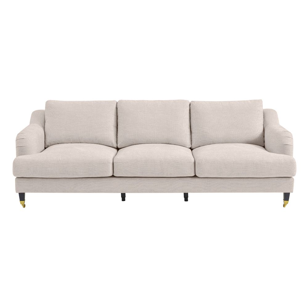 Introducing the Aerin Sofa Range: a contemporary twist on classic design. Its inviting silhouette, available in plush taupe velvet or natural linen, boasts modern proportions with timeless comfort. Featuring a reimagined "scroll armrest" for a relaxed feel, this sofa is both stylish and practical. For a touch of vintage elegance, antique-inspired detailing, including curved and turned legs, as well as brass casters, add charm and sophistication to any living room.