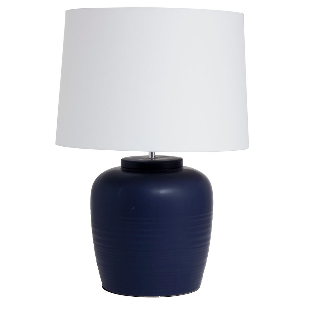 The ceramic table lamp features a rich matte navy blue base with subtle ribbed detailing, paired with a classic white fabric shade for timeless appeal. Perfect for modern or transitional interiors, it provides soft ambient lighting, ideal for bedrooms, living rooms, or workspaces. The navy hue adds a sophisticated touch, making this lamp a stylish yet functional accent for any space.