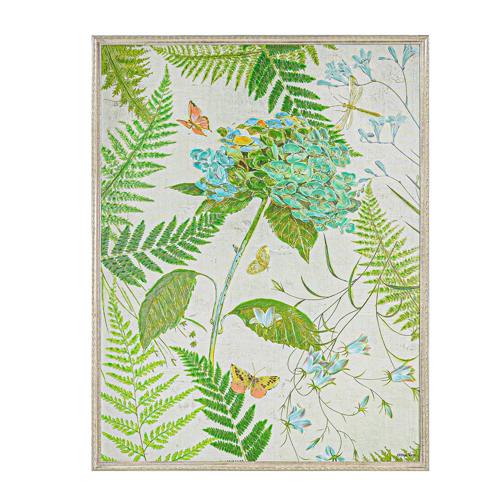 This stunning artwork by Kathryn White, an accomplished American artist, is an homage to nature's charm, blending vibrant hydrangeas, butterflies, and ferns. Inspired by her experiences across Europe and the Cotswold Hills, Kathryn masterfully fuses classical techniques with contemporary flair. Her intricate detailing in watercolours and egg tempera highlights her versatility. This piece captures timeless elegance, perfect for any decor.
