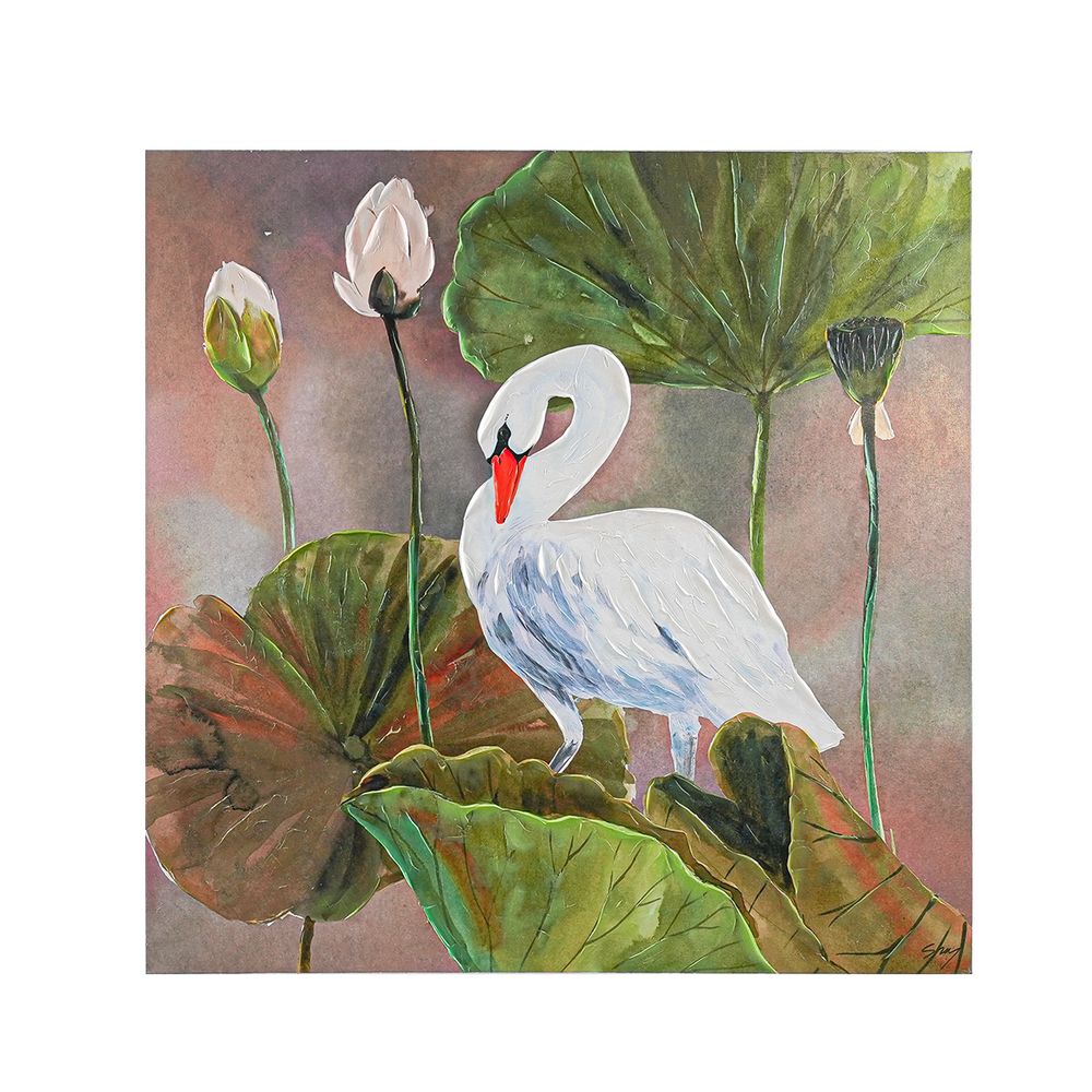 Celebrate elegance with Shay's exquisite swan-inspired artwork, an intricate blend of delicate textures and vibrant hues. This captivating piece, crafted by renowned American artist Shay, reflects her transition from a celebrated Cordon Bleu chef to a masterful painter. Featuring serene lotus blossoms and a graceful swan, the painting exudes tranquillity, inspired by the lush beauty of nature. Perfect for contemporary or classic interiors, Shay's art combines culinary precision with artistic flair, creating timeless décor for your space.
