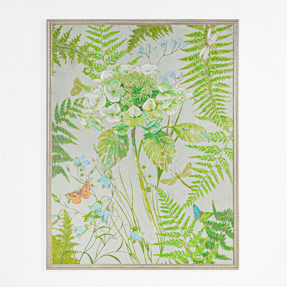 This exquisite artwork by Kathryn White, a celebrated American artist, is a vibrant celebration of nature’s elegance. Featuring intricate fern leaves, delicate hydrangeas, and enchanting butterflies, this painting reflects Kathryn’s inspiration from the classic charm of European landscapes and her Massachusetts studio. Painted with timeless techniques, it captures the seamless blend of tradition and contemporary artistry. A perfect addition to elevate home decor, its vibrant green palette radiates tranquillity and sophistication.