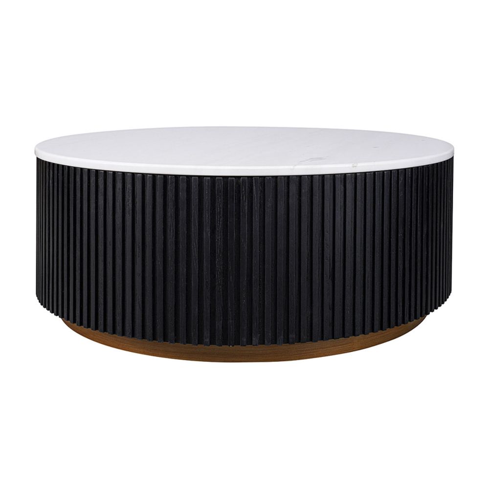 Elevate your living space with the Mason Round Coffee Table, a refined blend of modern design and timeless materials. Featuring a luxurious Sivec marble top with natural veining, it rests on a fluted oak wood base in a black finish, grounded by a subtle metal brushed antique gold plinth. Available in two sizes—large and medium—this table brings elegant contrast and texture to any setting, offering the perfect balance of durability, functionality, and sophisticated style.