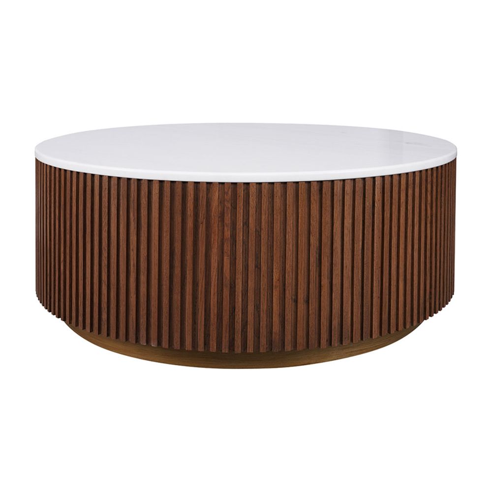 The Mason Round Coffee Table showcases timeless craftsmanship with a contemporary edge. Featuring a luxurious Sivec marble top with natural veining, it is set on a fluted oak wood base in a warm walnut finish, accented by a sleek metal gold plinth. Its round silhouette adds softness and balance to any space. Available in large and medium sizes, this piece offers versatile elegance, combining refined design with practical functionality for modern and classic interiors alike.