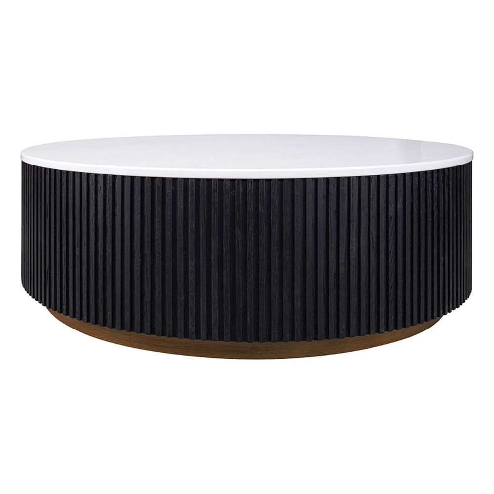 Elevate your living space with the Mason Round Coffee Table, a refined blend of modern design and timeless materials. Featuring a luxurious Sivec marble top with natural veining, it rests on a fluted oak wood base in a black finish, grounded by a subtle metal brushed antique gold plinth. Available in two sizes—large and medium—this table brings elegant contrast and texture to any setting, offering the perfect balance of durability, functionality, and sophisticated style.