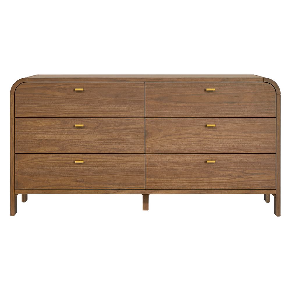 The Chisholm 6 Drawer Chest in Walnut combines sculptural form with everyday functionality. Crafted in a warm walnut veneer, this piece features a sleek curved frame, six generously sized drawers, and brushed gold T-bar handles. Full-extend metal runners ensure smooth access and durability, while the rounded corners and elevated base provide a refined, contemporary silhouette. A timeless storage solution for bedrooms or living spaces, it offers an elegant balance of design detail and practicality.