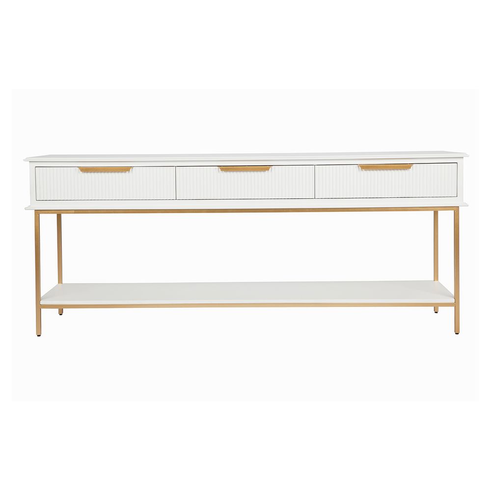 Classic contemporary in design, the large Aimee console table features three fluted drawer fronts and an elegant streamline profile in a satin white painted finish with contemporary gold metal hardware and iron frame. Also available in a smaller two drawer option, the Aimee range has been designed to slip seamlessly into both classic and modern interiors offering practical and stylish solutions for entry, hallway or living room spaces.