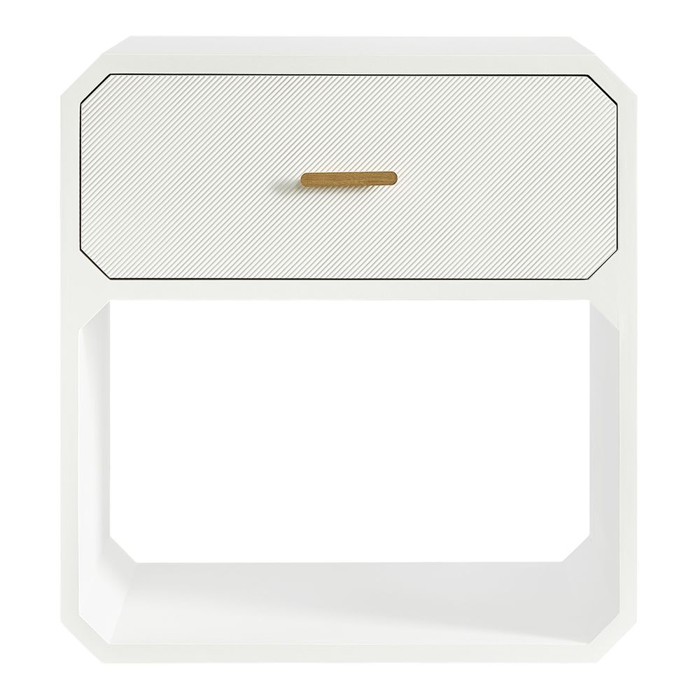 SOH:1 FROM SYDNEY SHOWROOM Ex-Sample Unit No Faults, Damages, No Carton - needs a light dusting/clean for it's forever home. Cannot ship to remote locations, only metro. Pickup preferred. DESCRIPTION: Compact and contemporary, this white 1-drawer accent table features diagonal fluting and a minimalist brass pull. Ideal as an entry, bedside or side table with space to display things underneath, it combines sleek aesthetics with everyday practicality. Clean finishes and bold design make it a standout piece for modern interiors with refined style.