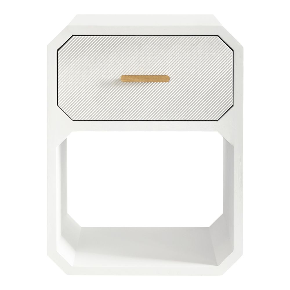 The Anderson Bedside Table – Small White offers a refined balance of sculptural design and everyday function. Finished in a crisp painted white ashwood veneer, it measures 50cm wide, 40cm deep and 65cm high – perfectly proportioned for modern bedrooms. A single textured drawer on durable metal runners provides smooth storage, while the open shelf below adds styling versatility. Accented with a brushed gold handle, its bold angular frame echoes the best-selling Anderson range. Elegant yet practical, it’s a timeless addition to contemporary interiors.