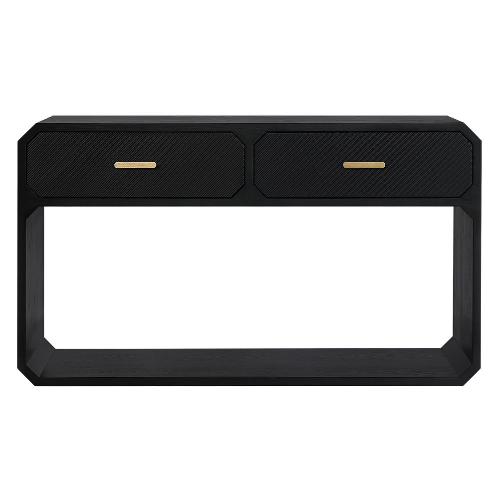 The Anderson Console Table in Black combines bold design with refined detailing. Crafted with a rich ashwood veneer, its two ribbed drawers with brushed antique gold handles add both function and sophistication. At 140cm wide, it offers ample storage and display space while maintaining a sleek open-frame silhouette that keeps interiors feeling light. Perfect for hallways, dining areas, or living rooms, this striking piece elevates contemporary and monochrome interiors. Also available in White and Antique Gold finishes for versatile styling.