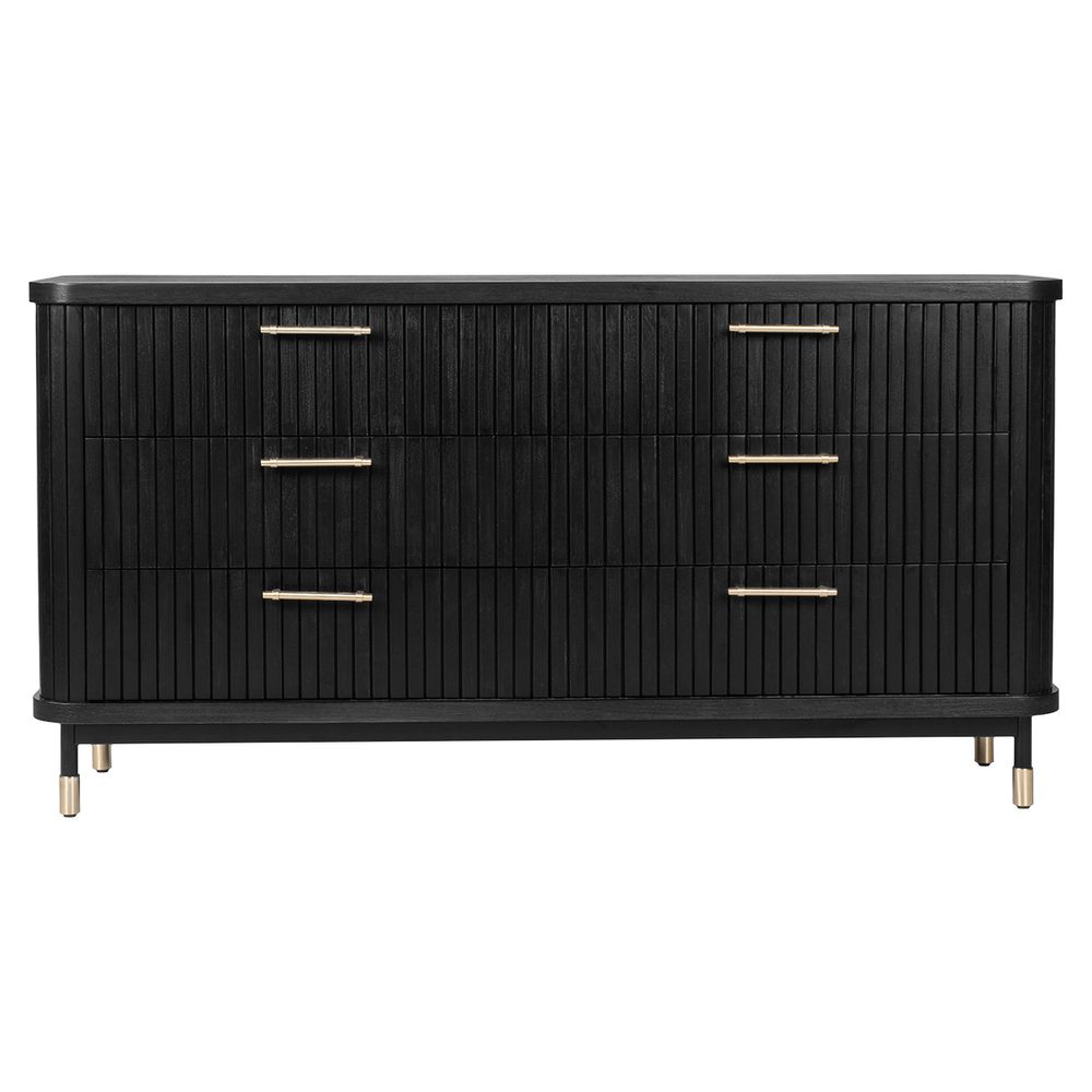The Sophia 6 Drawer Chest in Black brings timeless sophistication with a bold modern edge. Designed with vertical ribbed panelling, soft curved corners and brushed brass handles, this piece delivers architectural detail that elevates any interior. Generous storage is provided across six spacious drawers, set on smooth runners for everyday ease. Slimline legs finished with brass-capped detail add a touch of luxury, while the deep black finish enhances its dramatic appeal. Perfect for contemporary, modern, and boutique interiors, the Sophia Chest is also available in White and Natural Oak.