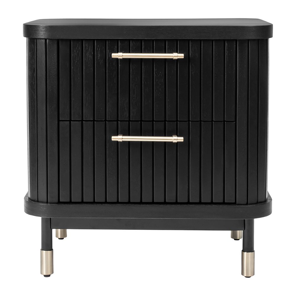 The Sophia 2 Drawer Bedside Table in black introduces elegant storage with a modern edge. Showcasing vertical fluted drawer fronts, refined gold handles, and slim legs with brass-capped feet, it brings architectural sophistication to any bedroom. Designed for both style and function, the two spacious drawers provide practical storage while maintaining a sleek, contemporary profile. Perfect for modern, coastal, and transitional interiors, this versatile bedside table is also available in white and natural oak finishes to suit a variety of design schemes.