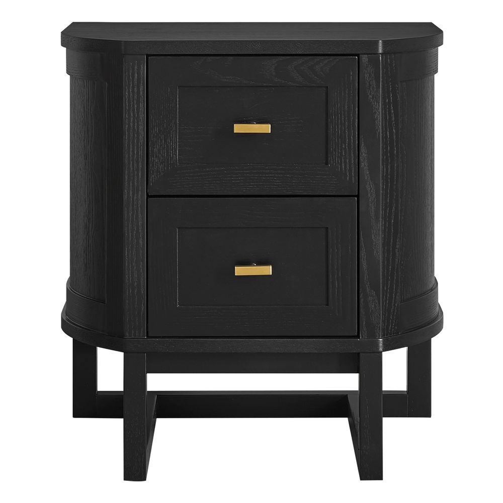 A sophisticated update to the beloved Theodore Range, the Theodore Bedside Table in Black introduces bold elegance and timeless functionality to the bedroom. Defined by the collection’s signature demilune silhouette, this compact piece offers two spacious drawers accented with brushed gold hardware. Its softly curved profile and streamlined base create a graceful yet striking presence, making it an ideal addition to both modern and traditionally styled interiors. Perfect for everyday use, this bedside table balances classic design with contemporary refinement.