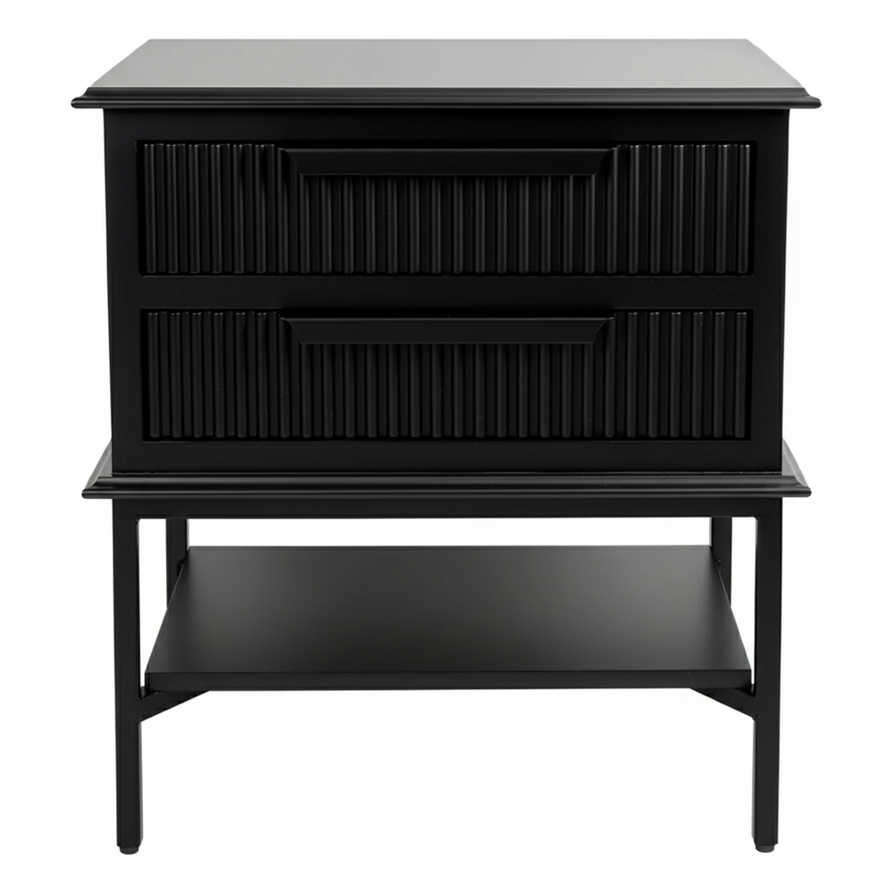 The Aimee Small Bedside Table is a compact bedroom storage solution designed for modern interiors. Its ribbed drawer fronts, bold rectangular handles and open shelf base offer both style and function. Finished in a fully colour-matched All White or All Black palette, it delivers a sleek monochrome look that complements minimalist, contemporary and coastal spaces. Ideal for small bedrooms, guest suites or apartment living, this space-saving bedside table combines practical organisation with refined sculptural appeal for a clean, cohesive aesthetic.