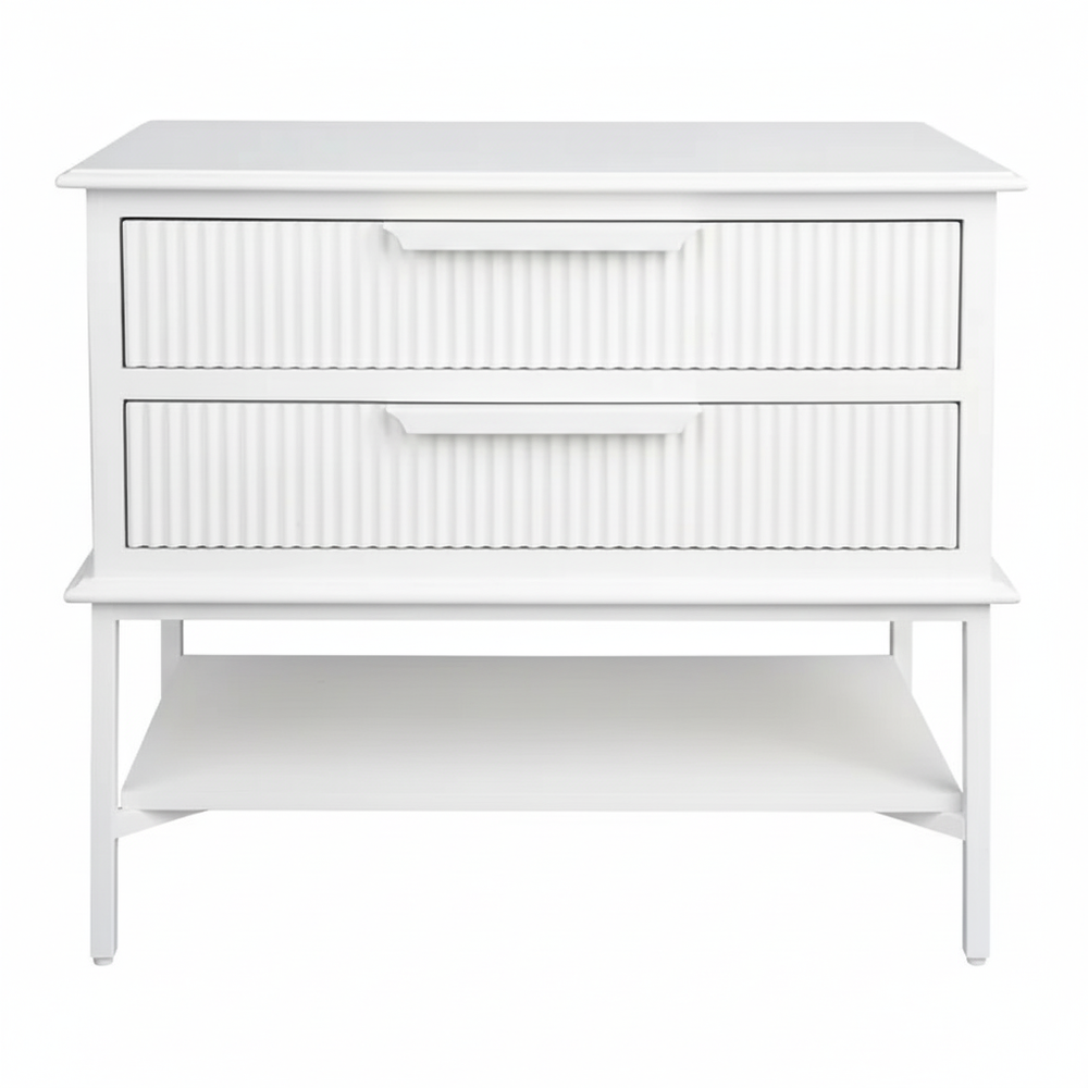 Bold in form yet refined in detail, the Aimee Bedside Table - Large offers a striking balance of elegance and functionality. Fluted drawer fronts, streamlined handles, and a spacious open shelf deliver practical storage with sculptural appeal. Its fully colour-matched finish available in All Black or All White creates a cohesive, monochrome aesthetic that complements a wide range of contemporary interiors. A versatile piece designed to bring understated sophistication to modern bedrooms.