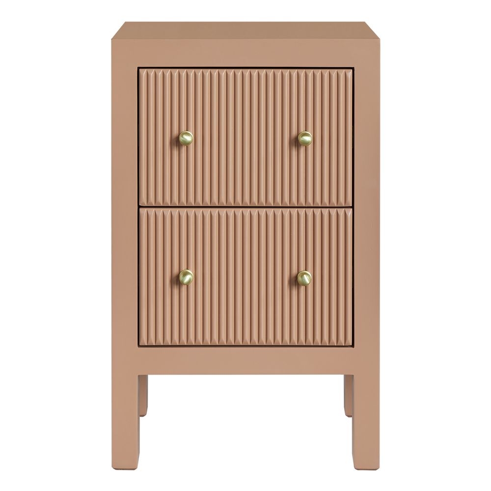 The Ariana Bedside Table Petite Mocha Mousse introduces warmth and refined elegance to compact bedroom spaces. Finished in a rich mocha tone — inspired by Pantone’s 2025 Color of the Year, PANTONE 17-1230 Mocha Mousse — this petite design rests on slim legs for a light, contemporary look. Two drawers with vertical fluted fronts glide smoothly on durable metal runners, accented by brushed brass knobs for a subtle touch of luxury. Combining practical storage with timeless appeal, Ariana is a versatile choice for modern and classic interiors alike.