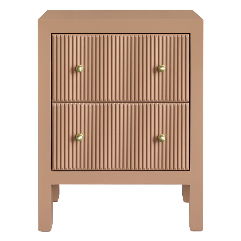 The Ariana Bedside Table Small Mocha Mousse evokes both luxury and warmth through its rich mocha tone — a hue aligned with Pantone’s 2025 Color of the Year, PANTONE 17-1230 Mocha Mousse, praised for its sensorial, grounding elegance. Its compact silhouette rests on slender legs for a light, elegant presence. Two drawers with vertical fluted detailing glide effortlessly on metal runners, crowned with delicate gold knobs for a subtle luxe accent. Ideal for smaller bedrooms, the Ariana merges timeless design with functional storage, making it a versatile and stylish addition to both modern and classic interiors.