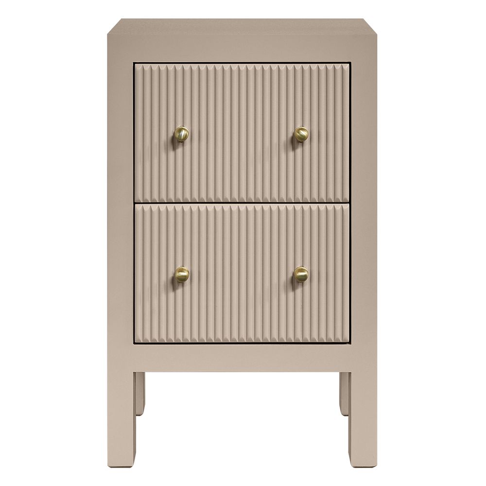 The Ariana Bedside Table Petite Beige brings timeless charm and everyday function to the bedroom. Finished in a soft beige tone, this compact piece is lifted on slender legs for an elegant, airy presence. Two drawers with vertical fluted fronts glide smoothly on durable metal runners, complemented by petite gold knobs that add a refined touch of luxury. Designed for smaller spaces, the Ariana blends understated style with practical storage, making it a versatile and sophisticated addition to modern and classic interiors.