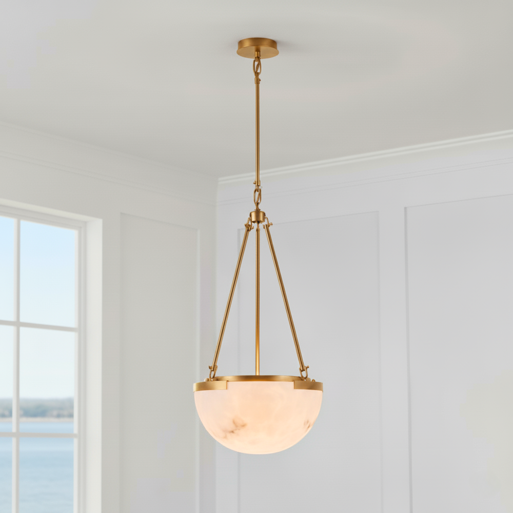 The Mishca Pendant Light in Antique Brass brings timeless sophistication and sculptural form to refined interiors. Featuring an electroplated antique brass frame and suspended alabaster-effect bowl diffuser, it casts a soft, ambient glow perfect for dining rooms, foyers, or stairwells. Its elongated silhouette and warm metallic finish create a statement centrepiece in both contemporary and classic spaces. Designed for elegance and versatility, the Mishca blends artful craftsmanship with ambient illumination. Also available in bold black for modern styling.