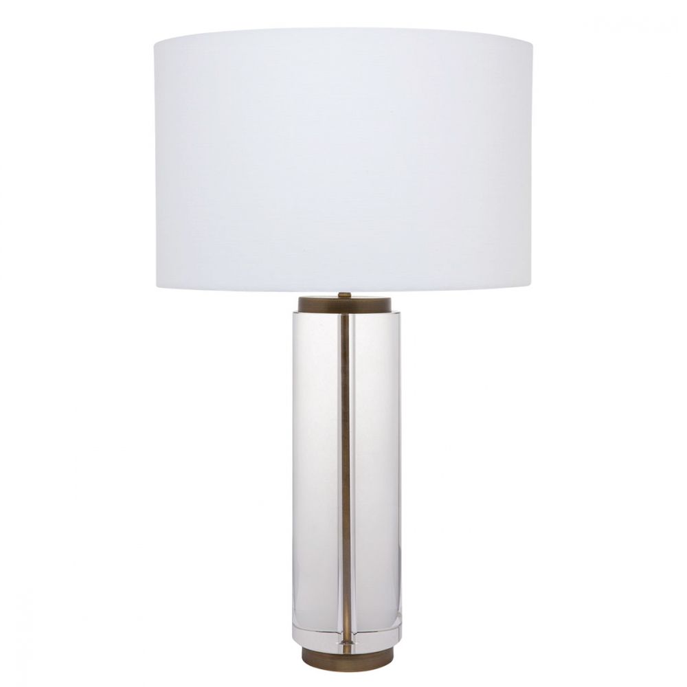 The Forrester Table Lamp features a sleek, solid clear crystal column that draws inspiration from the work of artisan transparent designers. Its elegant transparency is highlighted by a brass rod running through the crystal, complemented by a matching plinth for added sophistication. Topped with a crisp white linen shade, this lamp is a perfect blend of modern design and timeless style, making it an ideal addition to any contemporary space.