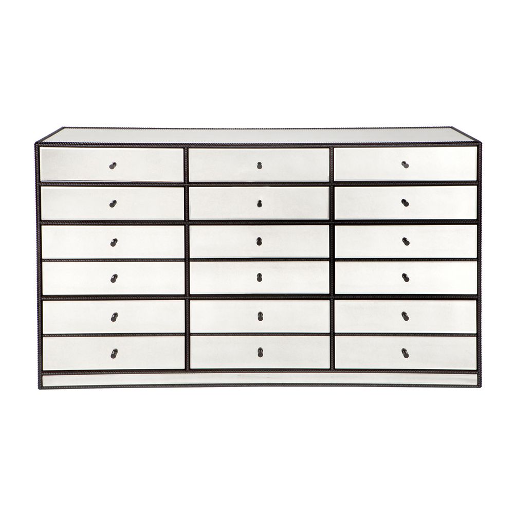 SOH:1 FROM SYDNEY SHOWROOM Ex-Display Unit No Faults, Damages, No Carton - needs a light dusting/clean for it's forever home. Cannot ship to remote locations, only metro. Pickup preferred. DESCRIPTION: Mixed materials and classic detailing harmonize favourable function in the Brentwood chest of drawers. The natural texture of a beaded timber frame is enhanced with a rich satin black finish, accompanied by delicate smoky inlaid antique mirror. Creating drama with a facade of sixteen drawers, the Brentwood chest offers twelve generously sized drawers without forgoing design, making this a smart storage option for elegant spaces.