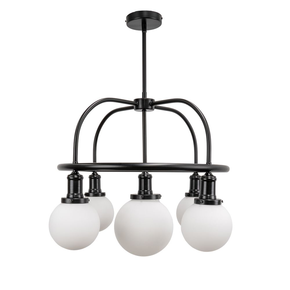SOH:1 FROM SYDNEY SHOWROOM Ex-Display Unit No Faults, Damages, No Carton - needs a light dusting/clean for it's forever home. Cannot ship to remote locations, only metro. Pickup preferred. DESCRIPTION: Featuring a cluster of glass milky spheres floating symmetrically beneath an elegant matt black iron ring and arms, the Bryant pendant references Mid-Century-Modern, industrial design and entices with its contemporary simplicity. Creating a sculptural statement, the Bryant pendant would be perfectly placed as a chic dining table centrepiece, creating a warm atmosphere with its gentle illumination.