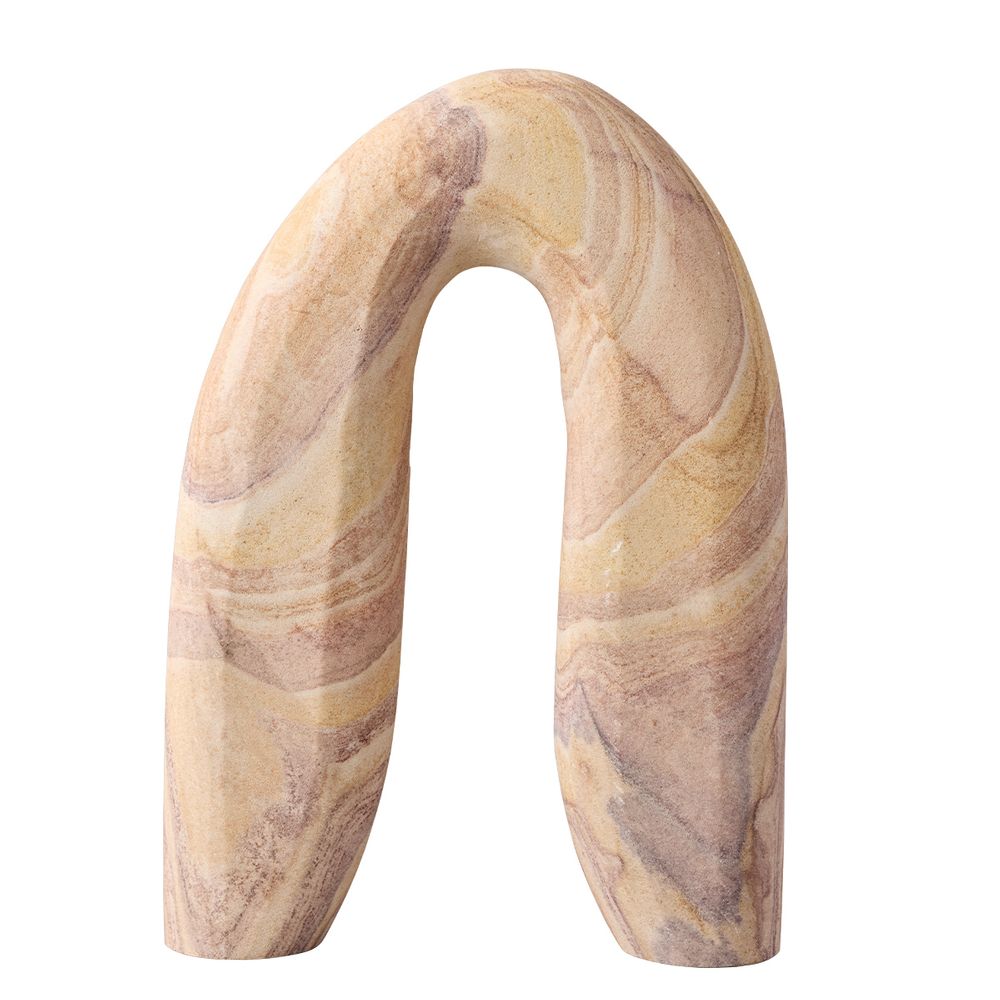 The Arch Marble Sculpture - Earth is a bold decorative accent crafted from solid rainbow stone marble with a smooth finish. Its curved, arch-like form brings organic movement and sculptural presence to any surface, from console tables to shelves. The natural tones of white, beige, and brown create a warm, earthy palette that complements both modern and rustic interiors. A striking standalone piece that adds depth and character to any space.