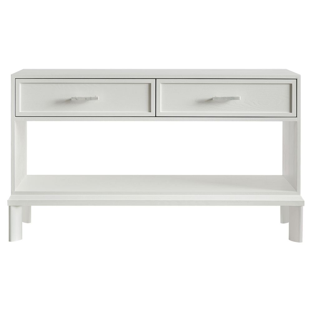 The Jill Console Table in White offers clean lines and understated elegance. Its crisp painted finish highlights the subtle grain of the wood, while polished white marble handles bring a refined accent. With two drawers for practical storage and an open lower shelf for display, this console blends form and function effortlessly. Perfect for hallways, living areas, or entryways seeking a fresh, timeless aesthetic.