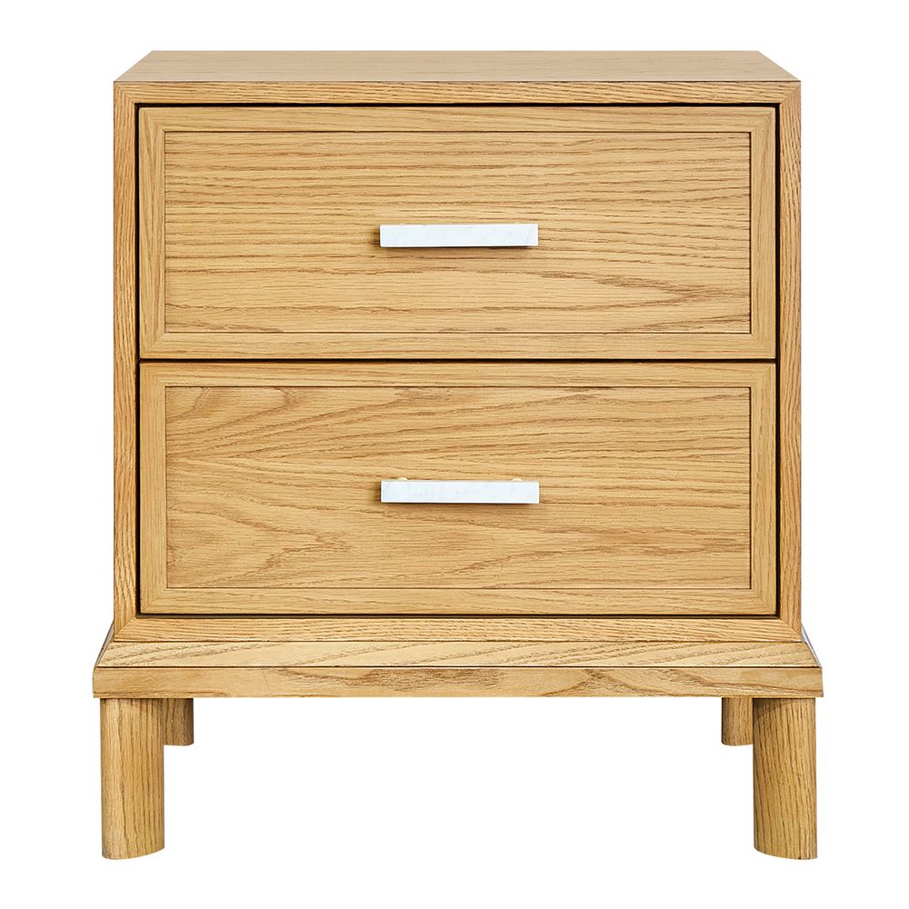 he Jill Bedside Table in Natural Oak brings a relaxed, organic charm to bedroom spaces. Designed with two practical drawers and elevated on rounded legs, it’s a functional and stylish addition. White marble handles offer a crisp contrast, highlighting the warmth of the timber for a balanced and versatile look.