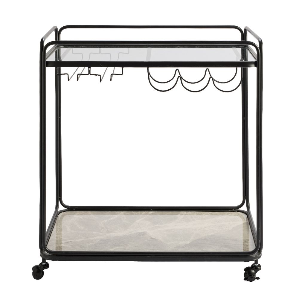 Clean-lined and contemporary, the Wentworth Rectangle Bar Cart in Black is designed for effortless entertaining. Crafted from a slim black metal frame with tempered glass shelving, its architectural silhouette feels light yet refined. Integrated glass and bottle holders provide practical storage, while smooth castors allow easy movement between spaces. A versatile piece with marble shelving for added luxury suits modern living rooms, dining areas, or home bars with understated confidence.