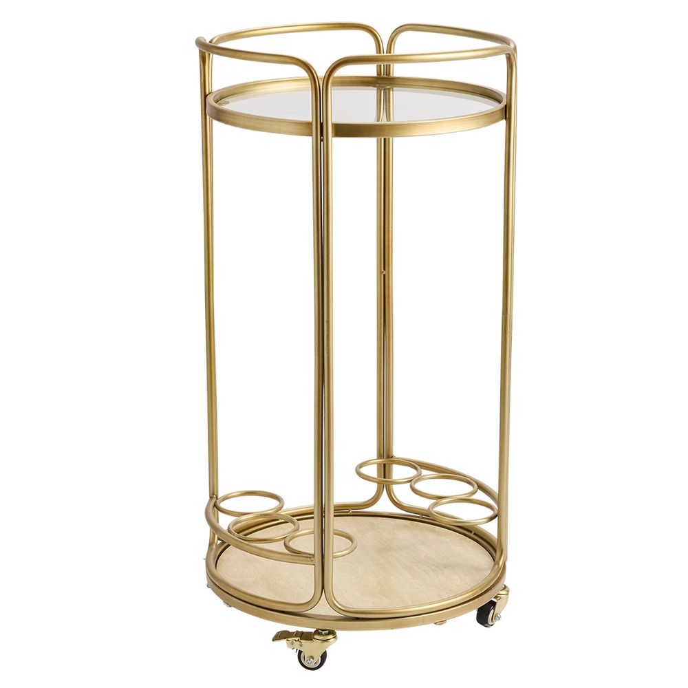 Striking yet timeless, the Wentworth Round Bar Cart in Antique Gold adds classic glamour to any interior. Featuring a brushed metal frame with sculptural circular detailing and a stone travertine look base, it offers generous storage for bottles and glassware. Smooth castors ensure effortless mobility, making it as functional as it is stylish. A statement piece designed for elegant entertaining.
