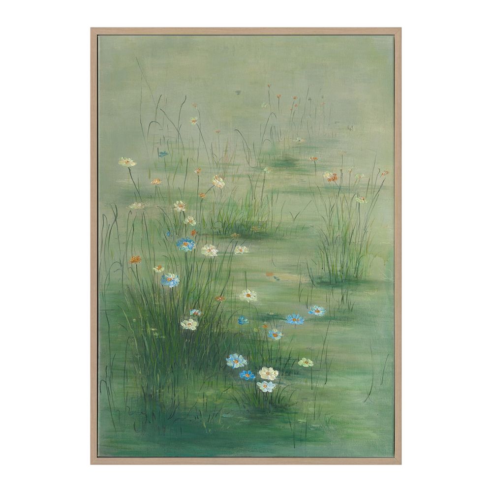 An enchanting scene of floating wildflowers, the Mosslight Magic Series II canvas painting captures a quiet moment in nature. With soft greens as its base, delicate wildflowers in white, ochre, and soft blue seem to drift across a tranquil water’s surface. Hand-painted with refined detail and set within a pale timber-look shadow box frame, this artwork infuses spaces with a calm, botanical elegance. Ideal for bedrooms, lounges or transitional spaces seeking a touch of organic charm.