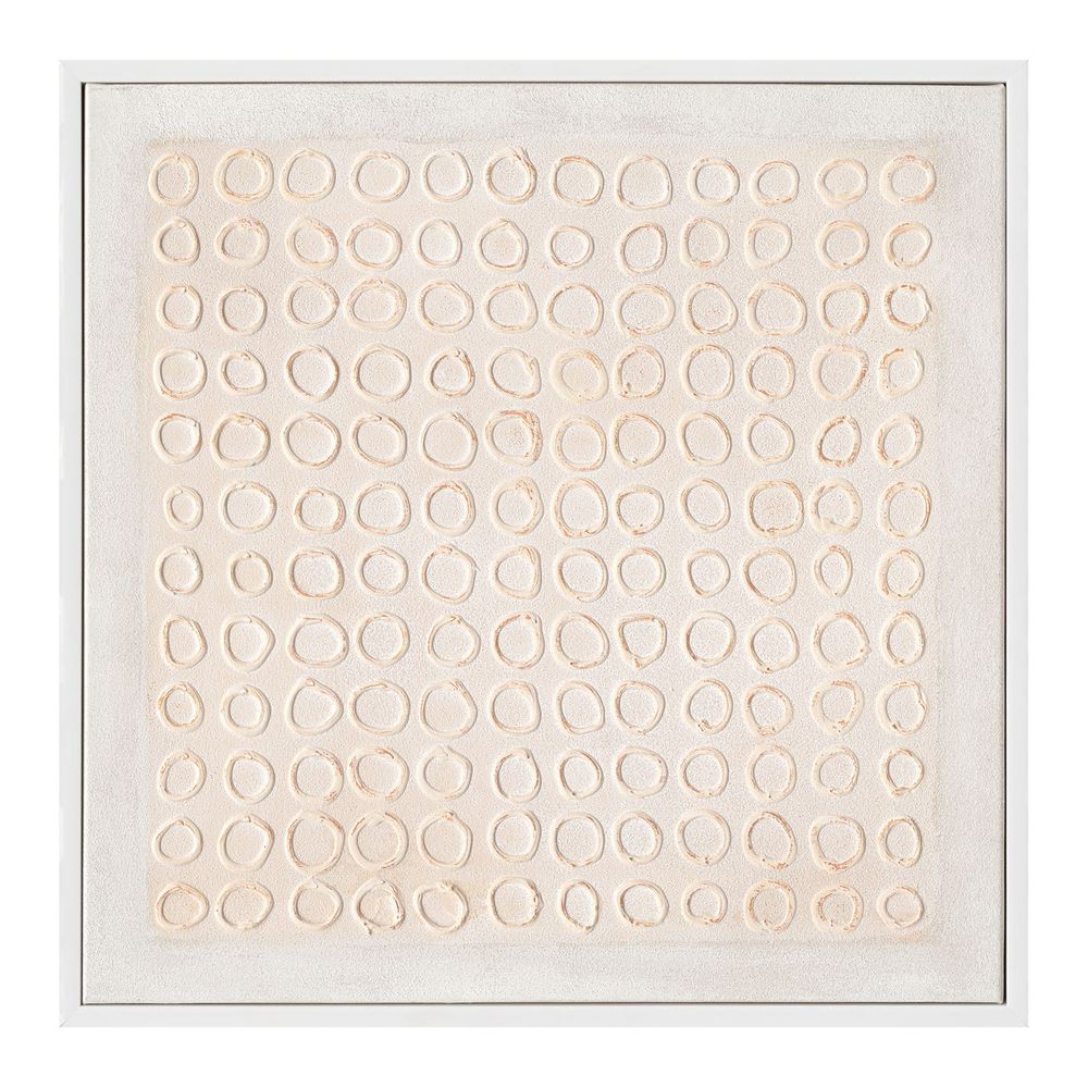 Celebrate the beauty of simplicity with the Unwritten Canvas Painting. Handpainted with 100% acrylic on canvas, this captivating piece features a soft, neutral palette and circular relief detailing that adds subtle dimension and rhythm. Each imperfect circle is intentionally organic, creating a tactile, textural effect that feels both refined and expressive. Set within a sleek white frame, this artwork brings a calming presence to contemporary interiors. Whether styled solo or as part of a gallery wall, its understated elegance and artisan quality make it a timeless addition to your space.