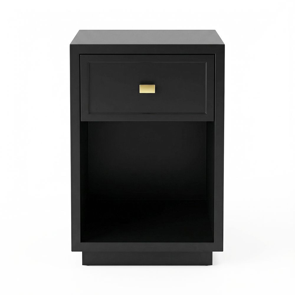 Sleek and striking, the Logan bedside table in satin black adds bold contrast to your bedroom. Defined lines and shaker-inspired panelling give it a refined edge, while the single drawer and open shelf maximise utility. The brushed gold handle offers a sharp accent, balancing modern minimalism with timeless appeal. Ideal for monochrome schemes or adding drama to soft neutral settings.