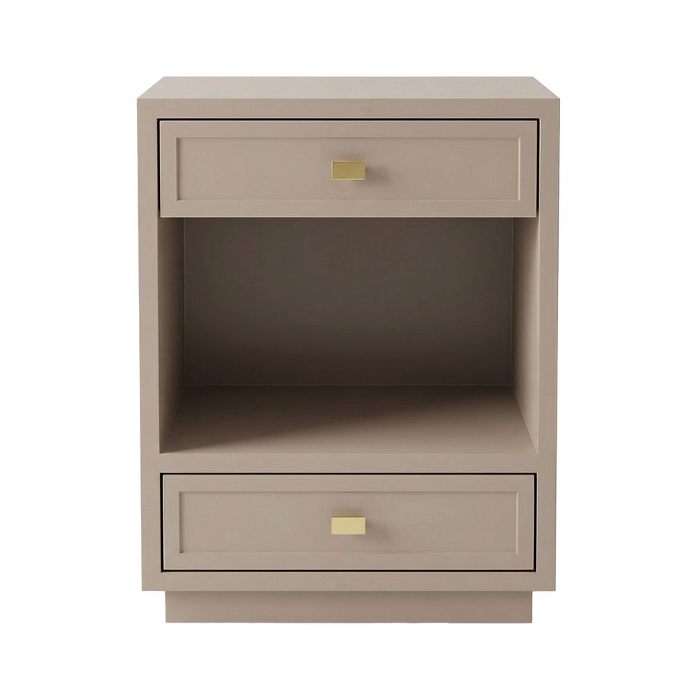 Elegant and grounded, the Logan bedside table in taupe introduces warmth and sophistication with its smooth satin finish. Its compact proportions make it ideal for smaller rooms or minimalist styling, while the subtle shaker detailing adds a touch of texture and depth. A double drawer with a refined handle—available in brushed gold or polished nickel—sits above a spacious open shelf, offering practical yet stylish storage. A versatile essential that seamlessly fits into modern or traditional spaces.
