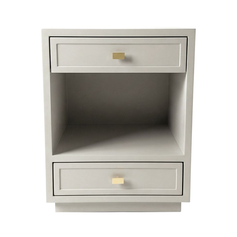 Elevate your bedroom with the Logan bedside table in soft grey. Its subtle shaker panelling and clean-edged silhouette are brought to life by a satin finish that adds depth and softness. Featuring a double drawer and open shelf, it balances practicality with polished design. Paired with a brushed gold handle, the Logan in grey blends seamlessly into modern and transitional spaces alike.