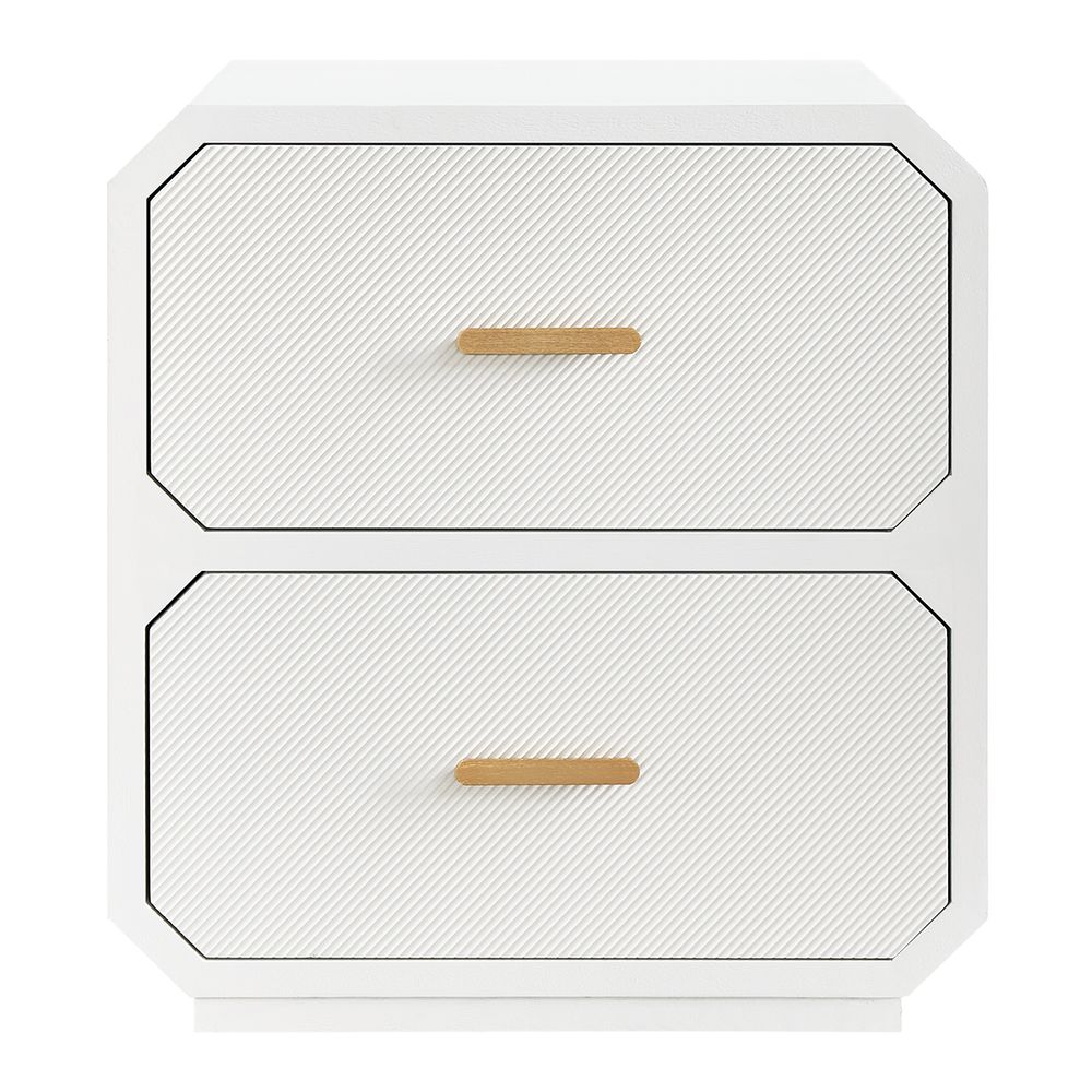 SOH:1 FROM SYDNEY SHOWROOM Ex-Display Unit No Faults, Damages, No Carton - needs a light dusting/clean for it's forever home. Cannot ship to remote locations, only metro. Pickup preferred. DESCRIPTION: The Anderson 2 Drawer Bedside Table in White brings a fresh sense of elegance to modern interiors. Finished in painted white ashwood veneer, its clean silhouette strikes the perfect balance of form and function. Two drawers with refined diagonal texturing glide smoothly on durable metal runners, accented by gold handles for a touch of sophistication. Designed for versatility, this piece complements Hamptons, transitional, and contemporary spaces with timeless charm. Part of a range also available in Black and Antique Gold.
